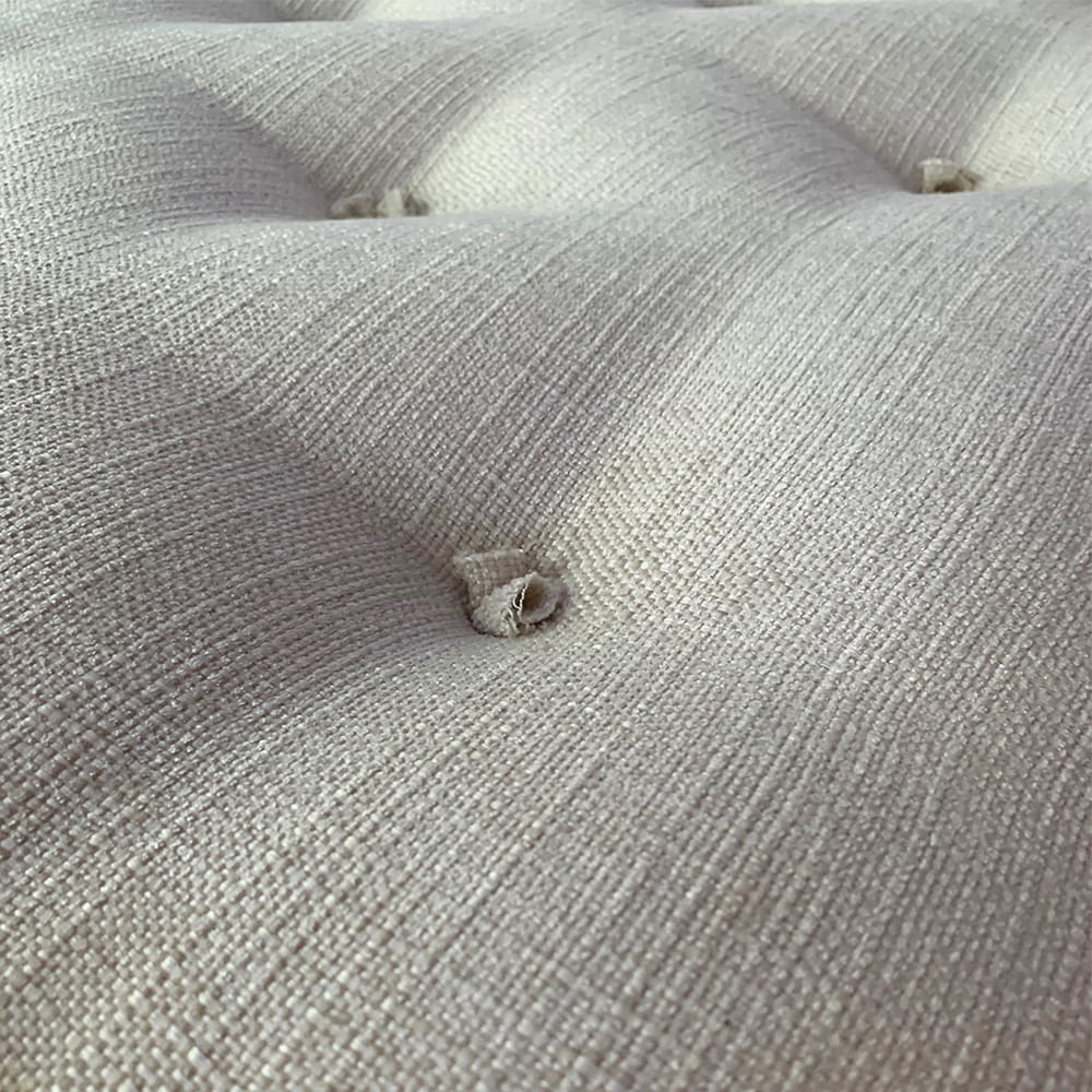 Artystyczny Detal: Zrezygnowaliśmy z klasycznych guzików. Zamiast nich, w miejscach pikowania, umieściliśmy efektowne kokardki z tkaniny, które nadają meblowi unikalnego, niemal modowego charakteru.